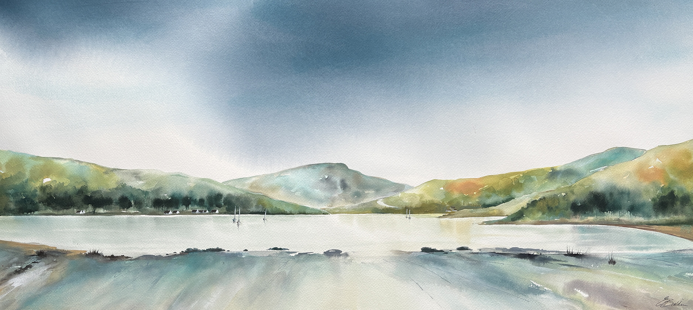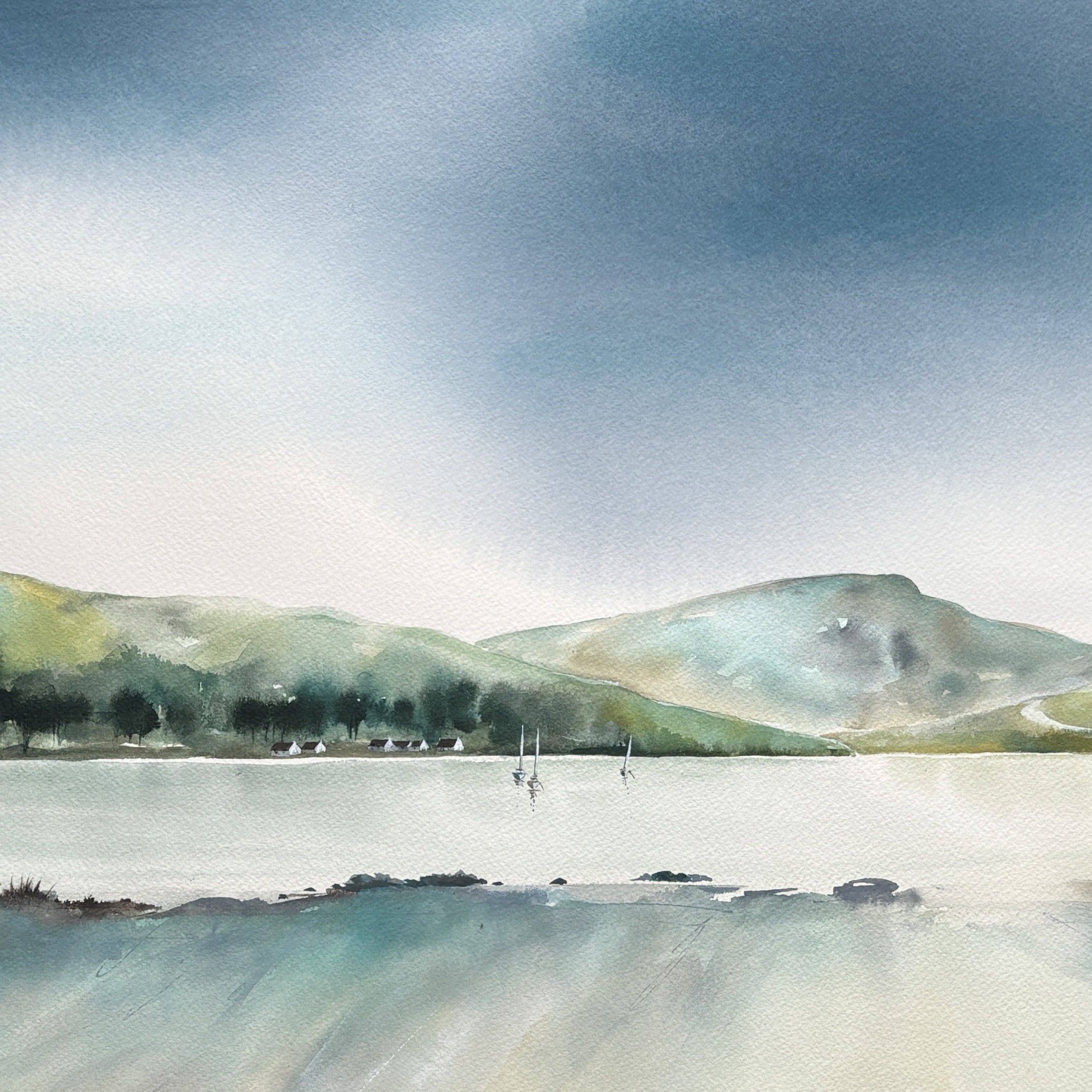 This painting in ink and watercolour is about the transition of light over the Isle of Arran. I wanted to capture the heavy, indigo weight of the morning clouds before the sun fully clears the surrounding hills. The focus here is on the stillness of the loch and the way the light begins to catch the masts of the boats in the bay.