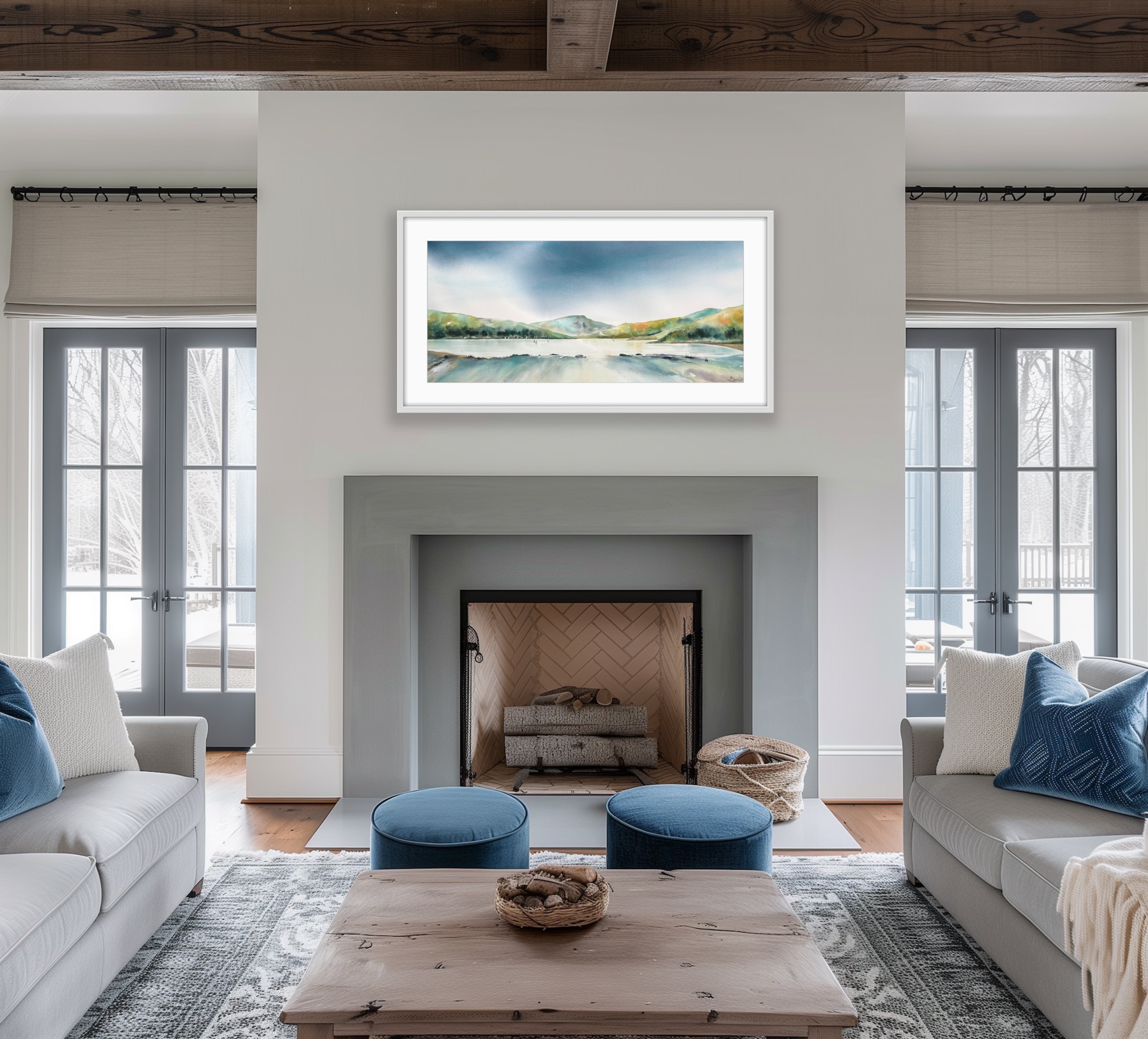 This painting comes framed behind glass with a white mount and a modern white frame, strung and ready to hang